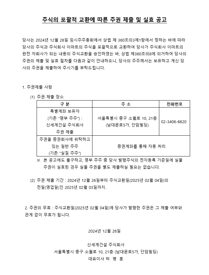 주식의 포괄적 교환에 따른 주권 제출 및 실효 공고